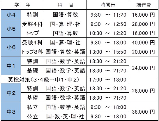 授業料袋は後日配布いたします。銀行口座振替の方は、上記講習費が1月分授業料と共に1月5日(月)に引落しとなります。なお、冬期特訓講習も兄弟同時割引の制度が適用されます。